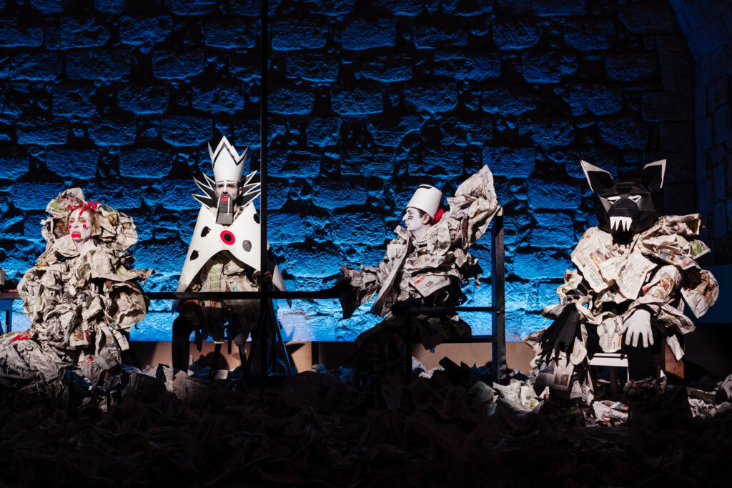 La pièce Ubu roi, Alfred Jarry l’a écrit adolescent, pour se moquer de ses professeurs. Elle était si subversive pour son temps qu’elle est vite devenue un classique. Elle est reconnue pour sa portée universelle qui naît d’archétypes. De la même manière, avec simplicité et subversion, Robert Wilson et ses co-créateurs démontent et utilisent l’essence de la pièce comme source d’inspiration. Cela leur permet d’approcher la folie du pouvoir par différents angles, la tyrannie, l’arbitraire, la cruauté, l’absurde, la lâcheté, la mort.